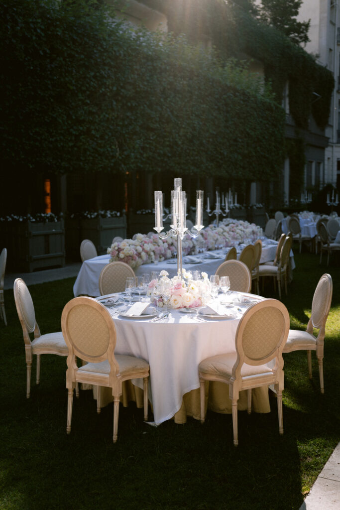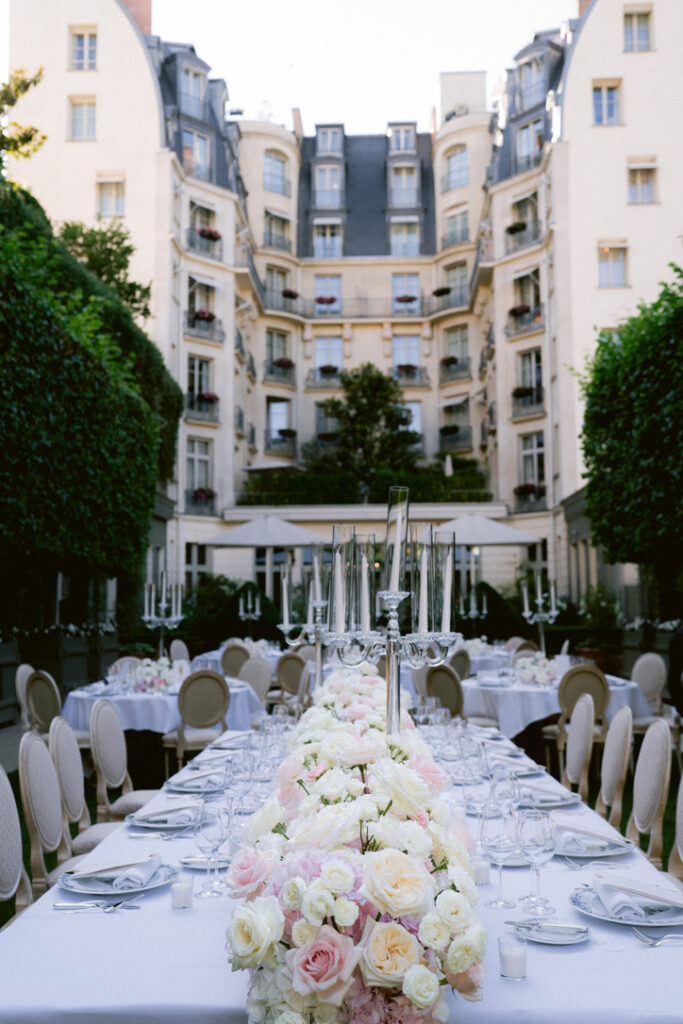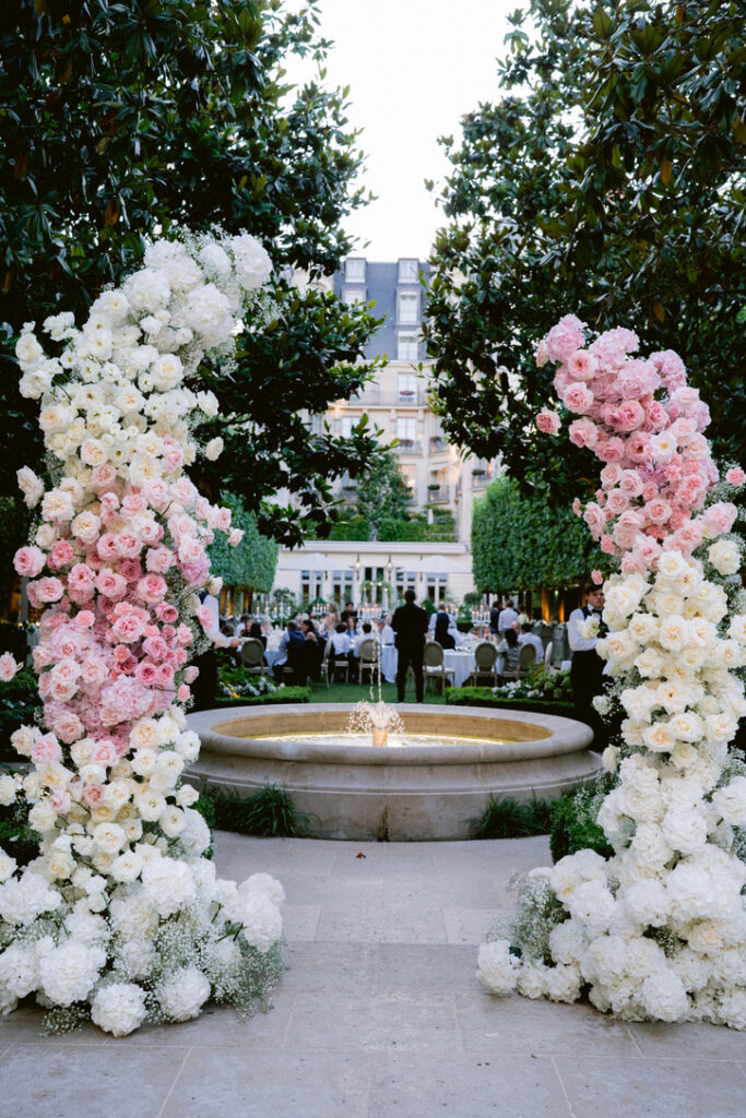 As guests entered the reception space, they stepped into a floral dream. Pink and white tones embraced the room. The blooms appeared almost luminous under the Ritz Paris lighting. The atmosphere felt intimate, elegant, and celebratory.