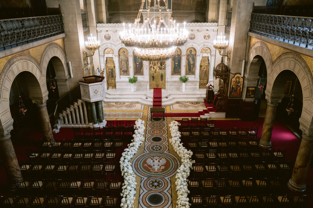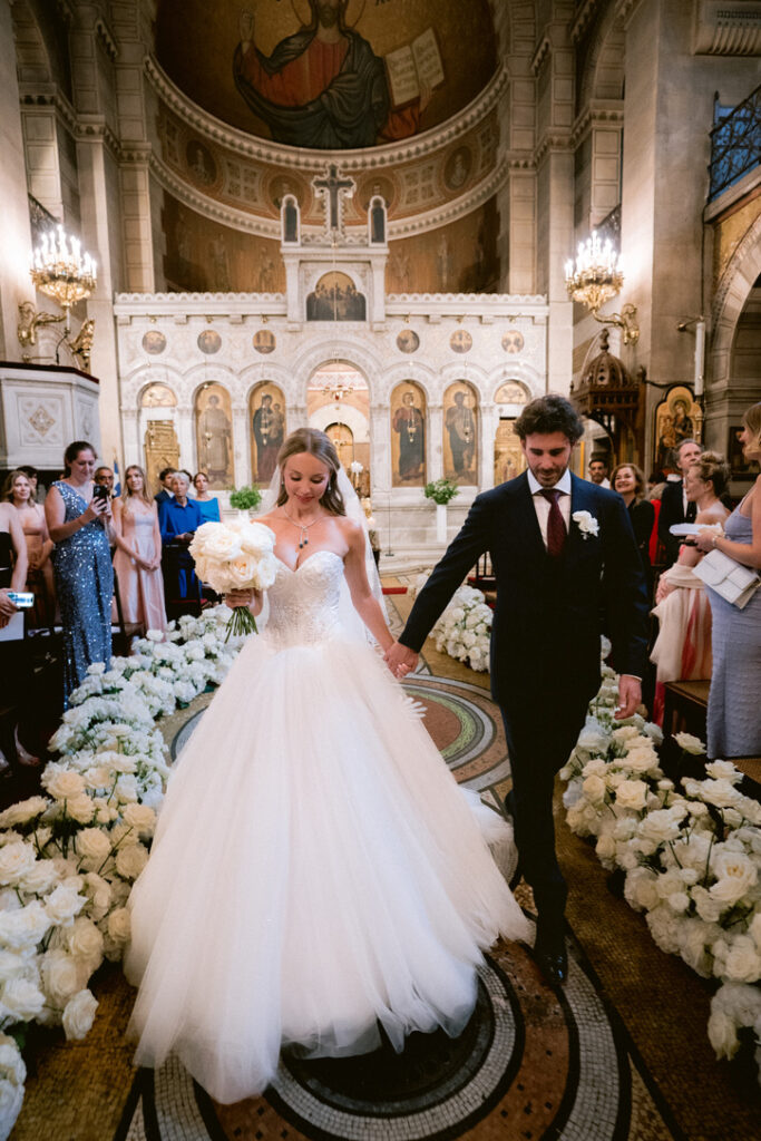 Matilda and Alexandre’s religious ceremony took place at the Greek Orthodox Cathedral of Saint Stephen, a historic and spiritual gem in Paris. The cathedral’s architecture, with its icons and golden details, provided a majestic frame for the couple’s vows.